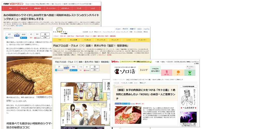 企業が運営するオウンドメディアの成功例として語られる事も多い、ぐるなび「みんなのごはん」には立ち上げ期から参画させて頂き、現在までに数百本単位のコンテンツを制作。その他にも「メシコレ」「ぐるなびウェブマガジン」「レッツエンジョイ東京」「ULTRAMAN公式サイト」などに加え、人材系サイト、旅行系サイト、地域情報サイトなどのコンテンツも制作。徐々にコンテンツ制作の本数を拡大させています。